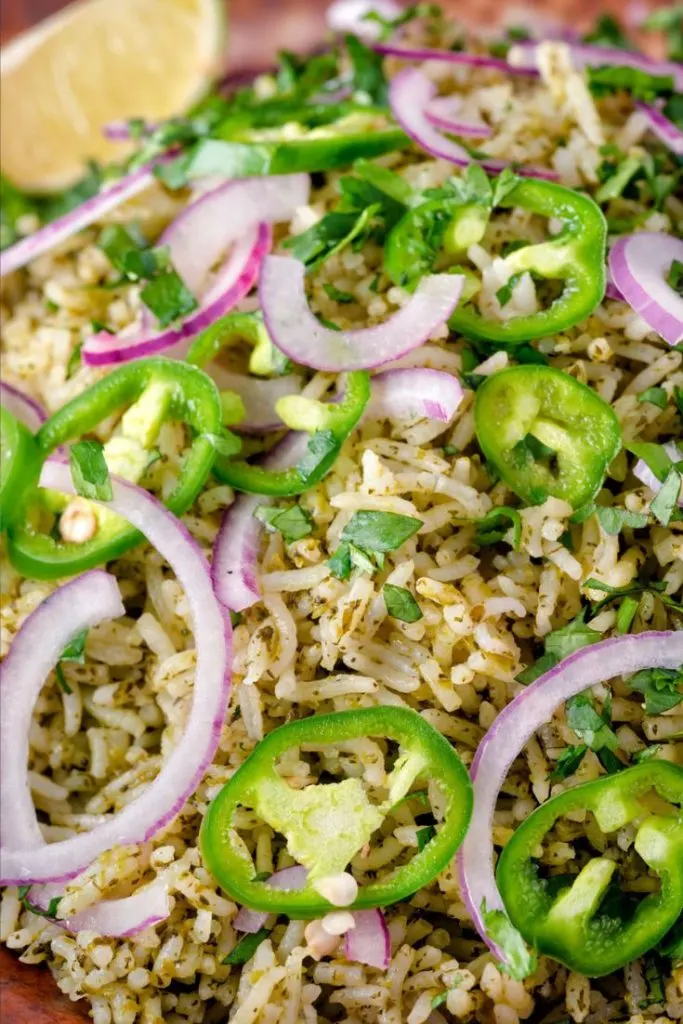 Green rice dishes are made with veggies, herbs, and peppers with a vibrant green color. When you make green rice, you don't need any artificial food coloring.